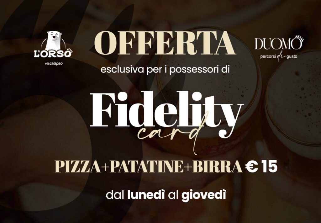 È arrivata la Fidelity Card dei locali L’Orso, Duomo, L’Orso in Teglia e Blanco! Un’unica card per vivere al meglio i tuoi locali preferiti: raccogli punti ad ogni acquisto, accedi a promozioni dedicate e scopri vantaggi esclusivi riservati ai membri della community. Attivarla è semplice e gratuita: attivala subito, CLICCA QUI.